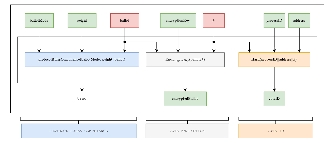 1.   *Vote casting*. Voters select their preferred choices according to the voting rules established by the organizer and captured in the process management smart contract. Instead of submitting their votes directly on-chain, they send them off-chain to a sequencer of their choice for processing. To ensure privacy, votes are encrypted using the available encryption public key. Additionally, voters compute a unique vote identifier that will allow them to verify that their vote has been included in the final result. Alongside the encrypted vote and the vote identifier, each voter must also provide the following data: a proof of valid voting, demonstrating that the vote complies with the election rules; a proof of eligibility, verifying that they are registered in the census; and a proof of identity ownership, in the form of a digital signature, confirming that they are the legitimate voter and are not impersonating someone else. To mitigate coercion and vote-buying, the protocol allows voters to overwrite their vote any number of times during the voting phase.