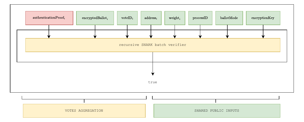 We focus on a specific type of proof system called zero-knowledge succinct non-interactive arguments of knowledge (<span acronym-label="ZK-SNARK" acronym-form="plural+abbrv">ZK-SNARKs</span>). Informally, while a <span acronym-label="ZK" acronym-form="singular+short">ZK</span> proof convinces the verifier that a valid witness exists, an argument of knowledge additionally ensures that the prover actually knows such a witness, except with negligible probability. <span acronym-label="ZK-SNARK" acronym-form="plural+abbrv">ZK-SNARKs</span> extend this notion with two crucial properties: they are non-interactive, requiring only a single message from prover to verifier, and succinct, meaning that proof size and verification cost remain small regardless of the size of the underlying statement. For instance, Groth16 proofs (Groth 2016), which rely on pairing-based cryptography over elliptic curves, are only about 200 bytes long and can be verified in a few milliseconds. These properties make <span acronym-label="ZK-SNARK" acronym-form="plural+abbrv">ZK-SNARKs</span> particularly well-suited for blockchain applications, where verification cost and data size are critical. In DAVINCI, <span acronym-label="ZK-SNARK" acronym-form="plural+abbrv">ZK-SNARKs</span> are used at multiple stages of the protocol: voters generate proofs to show that their encrypted ballots are correct and sequencers use recursive <span acronym-label="ZK-SNARK" acronym-form="plural+abbrv">ZK-SNARKs</span> to allow multiple proofs to be aggregated efficiently and generate proofs to attest to valid state transitions. In essence, <span acronym-label="ZK-SNARK" acronym-form="plural+abbrv">ZK-SNARKs</span> enable both voters and sequencers to produce compact proofs that can be checked on-chain, ensuring that all protocol rules are followed without requiring trust in any party.