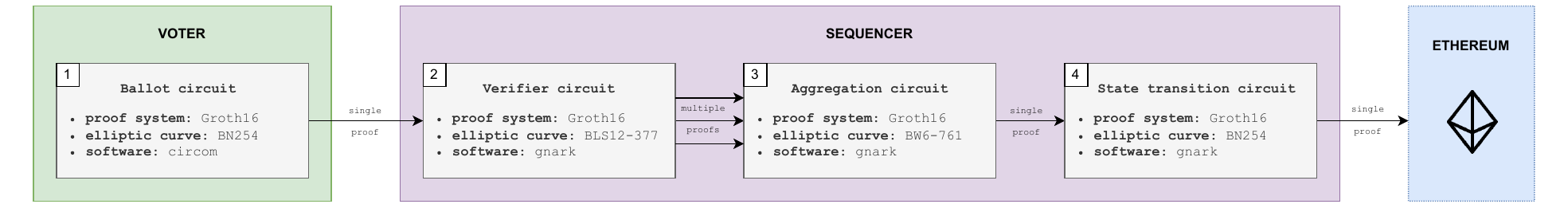 All ZK circuits in DAVINCI are compiled using the Groth16 proof system (Groth 2016), a widely adopted ZK-SNARK construction known for its succinctness, efficient verification, and minimal proof size. Although all circuits rely on the same proving system, they are instantiated with different elliptic curves depending on the cryptographic requirements of each phase. Specifically, the vote validity circuit is compiled over the BN254 curve, the census-related circuit uses BLS12-377, and the aggregation circuit is instantiated over BW6-761. Finally, the last circuit used by the sequencer—responsible for generating the final proof of correct tallying and result—is compiled over BN254 as well, since this is the proof that is verified on-chain by the smart contract using Ethereum’s native precompiles. Further details on the circuits are provided in Section sec:vocdoni-protocol:circuits and a summary of the instantiations can be found in Fig. fig:circuits-flow.