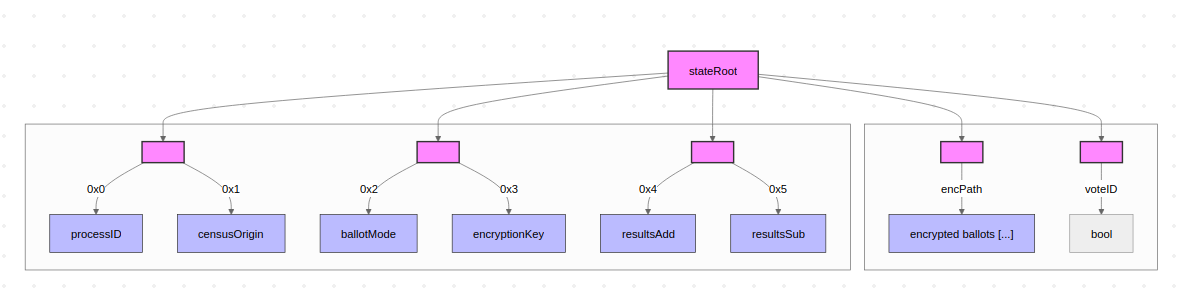 <figcaption>Structure of the state Merkle tree. The first leaves are reserved for global election parameters while subsequent leaves store vote identifiers and encrypted ballots.</figcaption>
