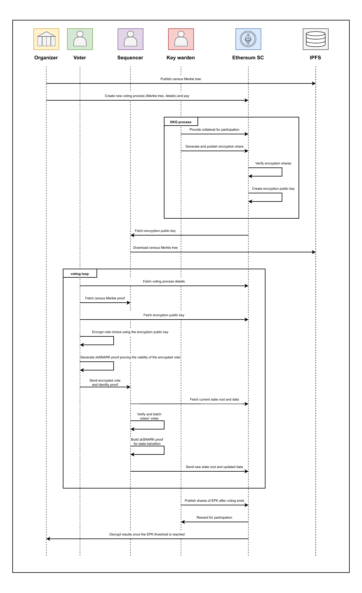 2.  *Encryption key generation.* A designated group of participants, referred to as *key wardens*, collaboratively generate a shared encryption public key, which voters will use to encrypt their votes. This key is established through a <span acronym-label="DKG" acronym-form="singular+short">DKG</span> protocol, ensuring that no single party can control or reconstruct the corresponding private key independently. Once the encryption public key is securely computed and published in the smart contract, the voting period can start.